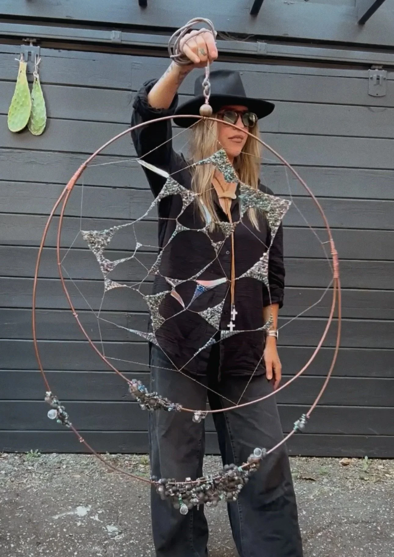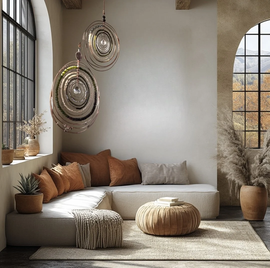 Each Essy Meyers piece is handmade and one of a kind. Materials are sourced intentionally and cleared energetically before work begins. Pieces are made to be suspended, felt, and lived with — hanging freely in your space, catching light from every direction.