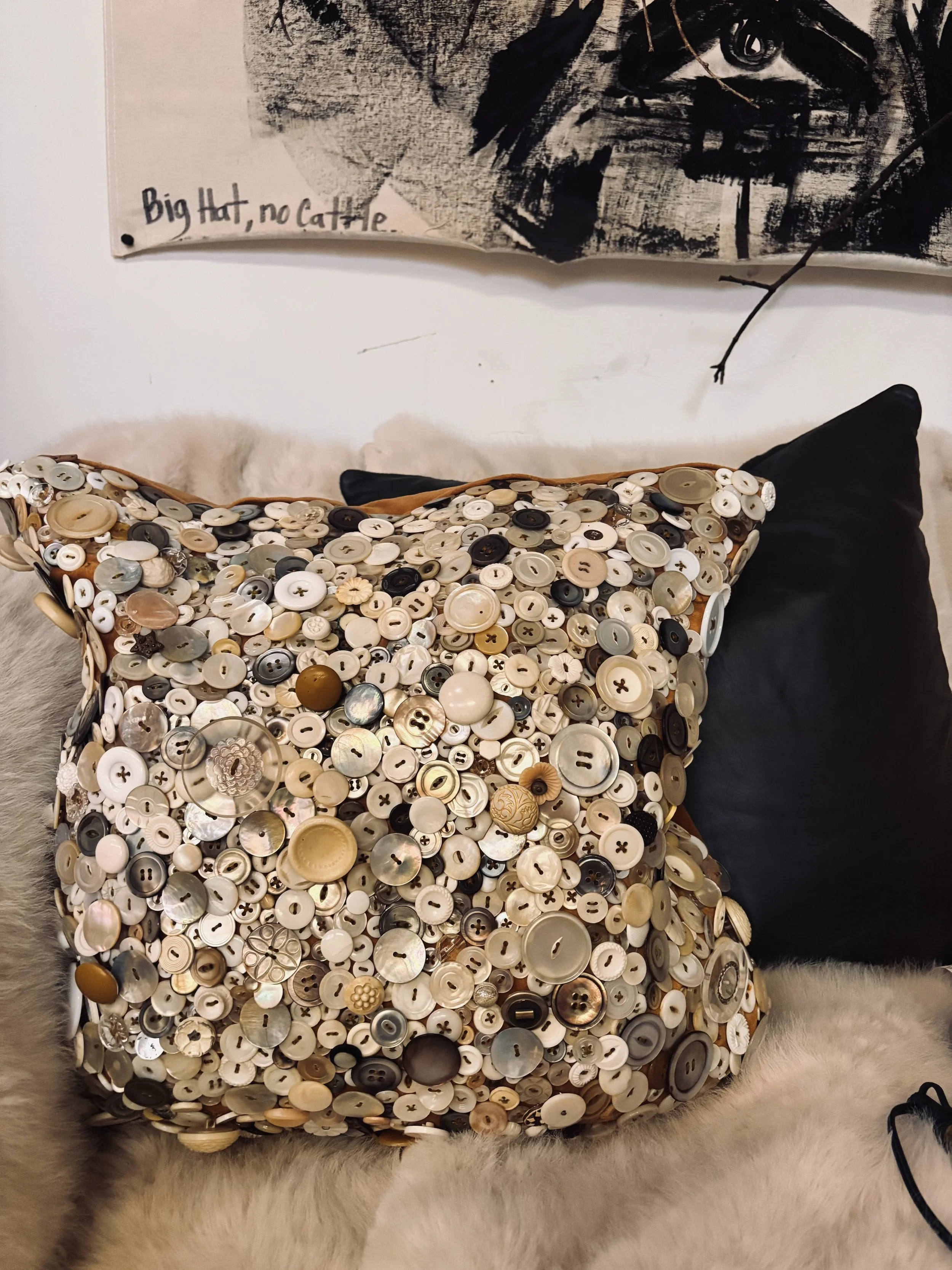 My pieces are handmade with love, by me. I feel there are so many prized possessions that deserve to take center stage—-like vintage buttons! This is my way of incorporating them into the home, to be enjoyed throughout the day by all. This pillow is such a conversation piece, and it adds the perfect touch of vintage and elevated home design.